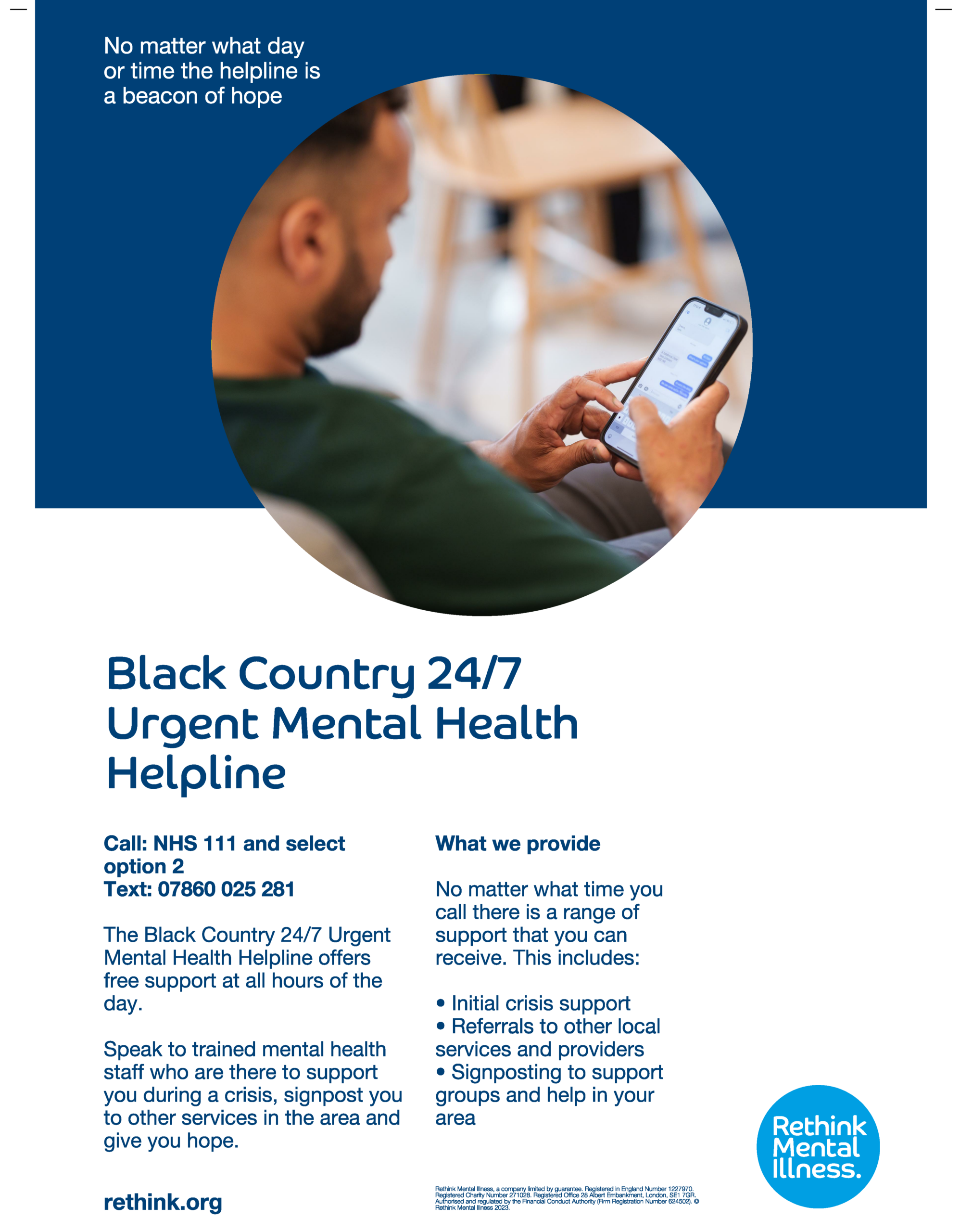 This free phone service is open 365 days a year and no referral is required. Support is available to people of any age living in the Black Country and experiencing urgent mental health difficulties or concerns.