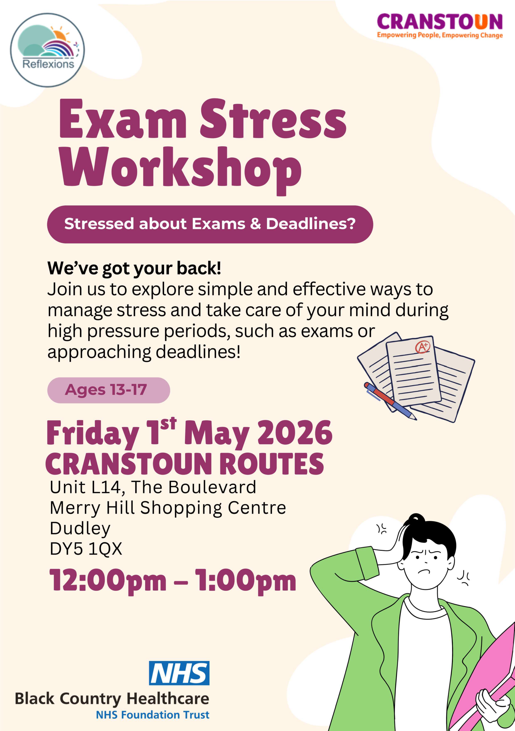 Join in the Exam Stress Workshop taking place on Friday 1st May 2026, 12:00pm–1:00pm at Cranstoun Routes, Unit L14, The Boulevard, Merry Hill Shopping Centre, Dudley, DY5 1QX.