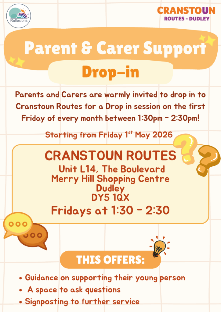 Parents and carers are invited to drop in for support at Cranstoun Routes on the first Friday of every month, starting Friday 1st May 2026, from 1:30pm–2:30pm.